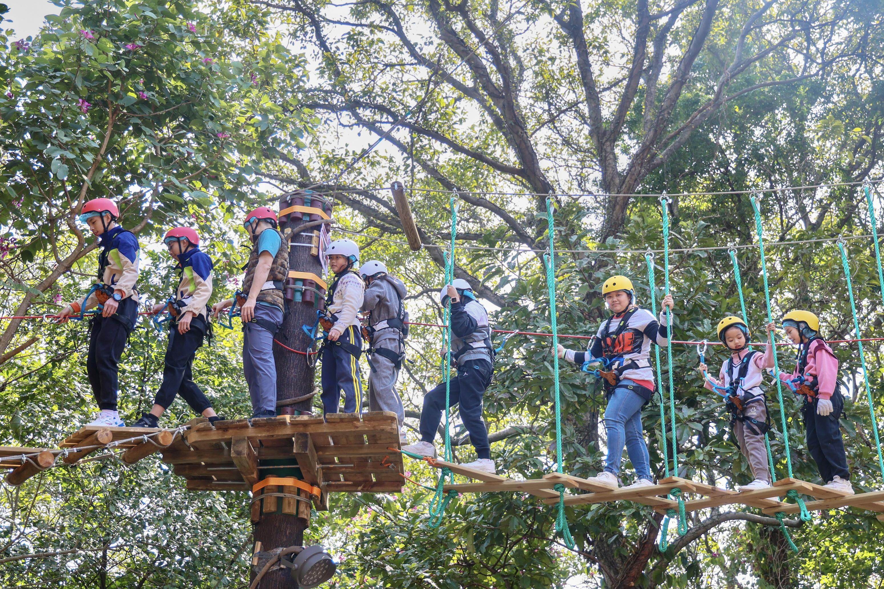 云山丛林飞跃探险乐园内有勇士、英雄、王者、至尊等4条不同难度的挑战路线,让孩子们不用去郊区或外地,在城央就可以参与户外运动拓展,当一回小小“冒险家”。