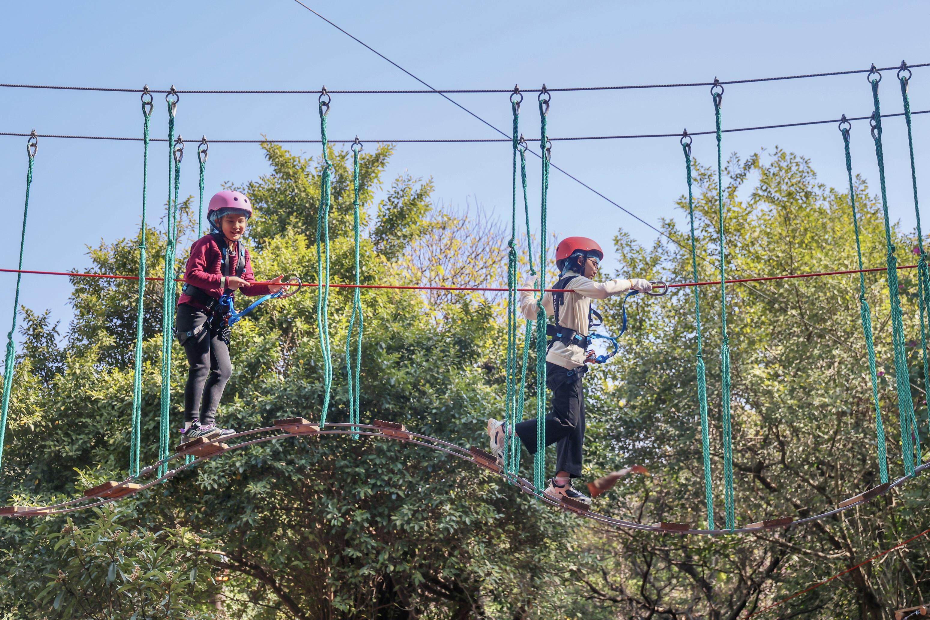园方介绍,勇士路线主打安心,带有力量、启发性的陪伴,适合1.2米(含)以上的小朋友。全程教练陪伴,即使是小白也可以放胆挑战自我。大家可以攀上云端,在树冠上鸟瞰丛林,观花赏叶,最后几个关卡当中,挂在飞索上,飞越园区,穿越丛林。